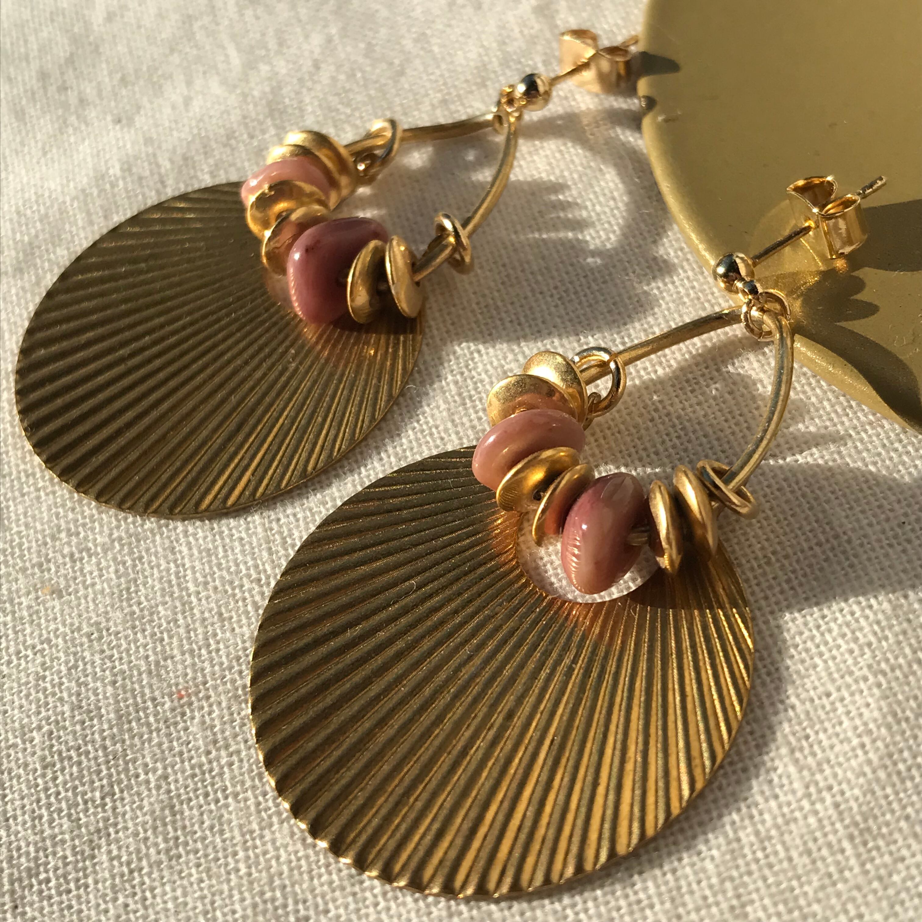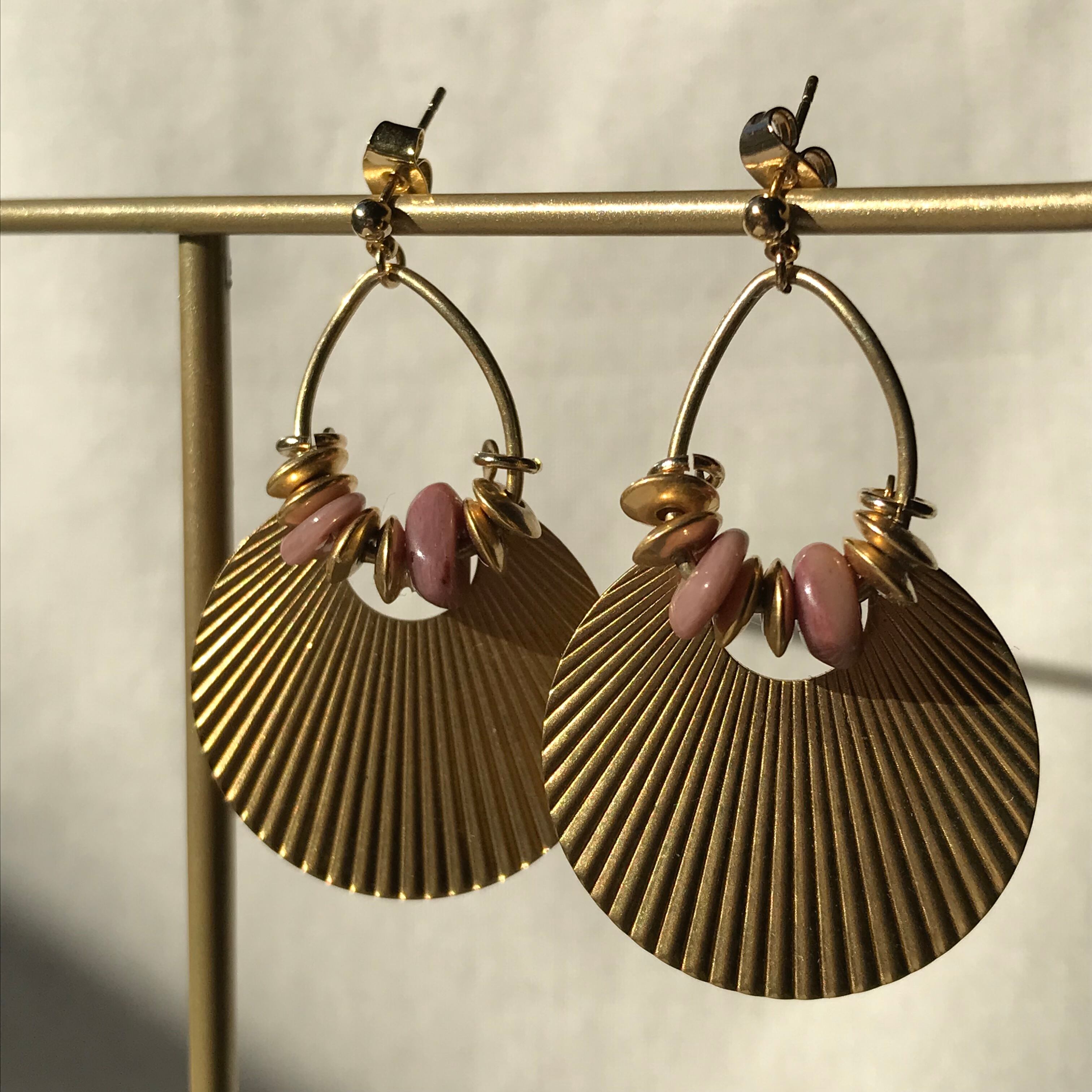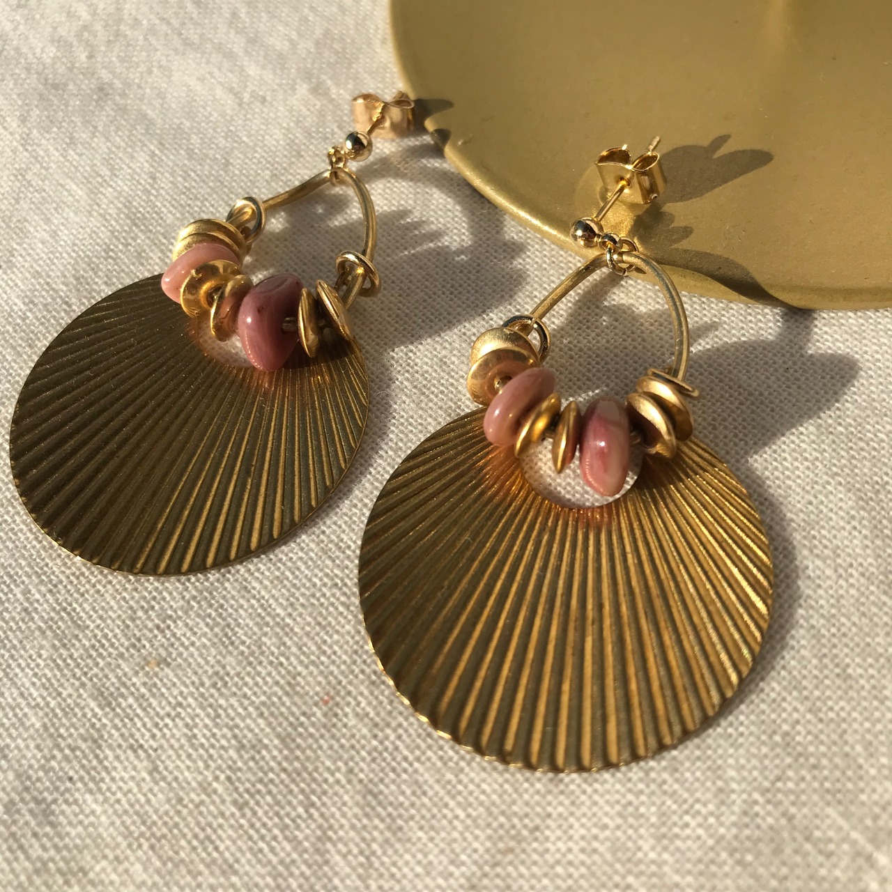 真鍮パーツとダークピンクのストーンビーズなどを使用した